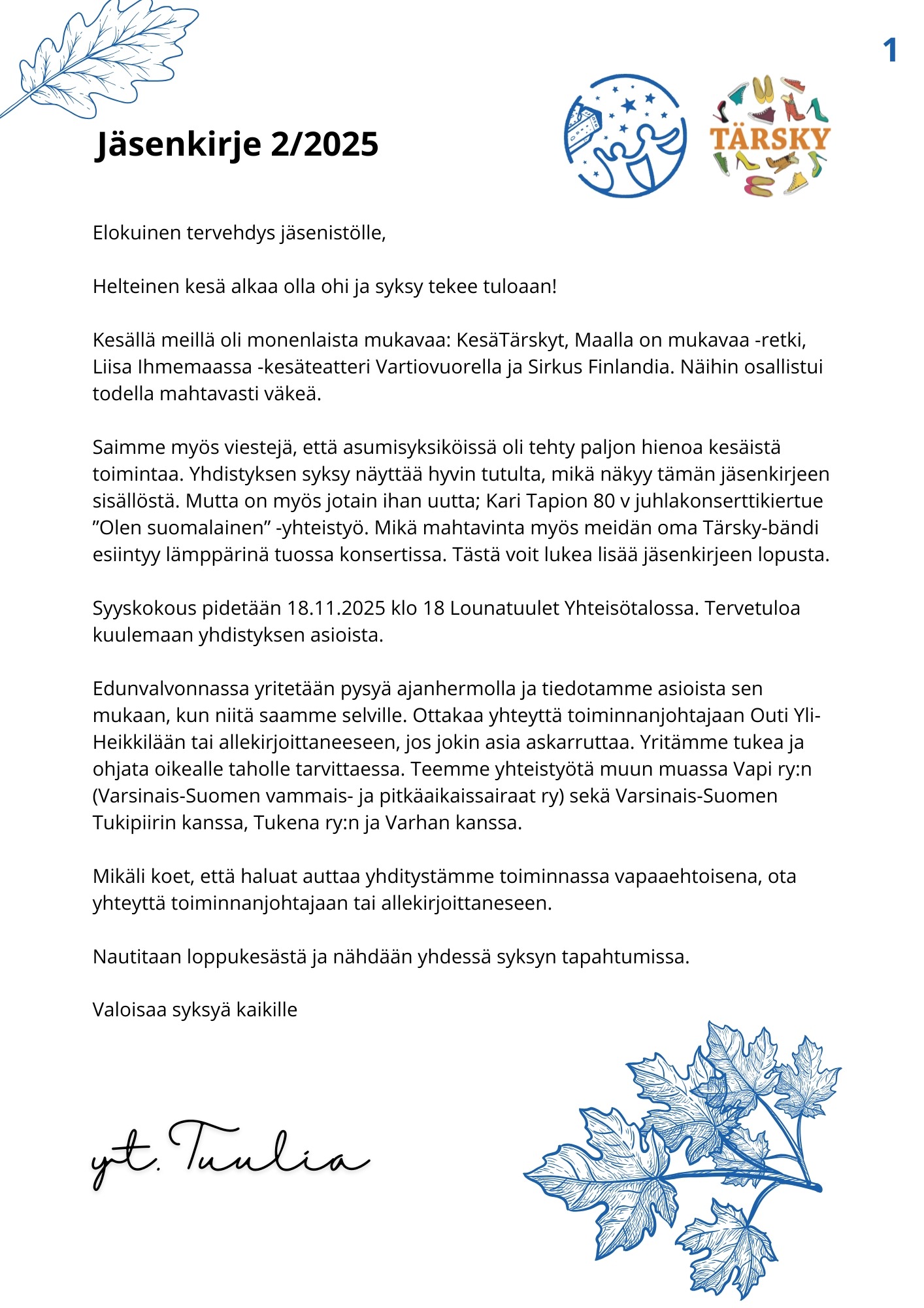 Tälle sivulle päivitämme uusimman yhdistyksen jäsenkirjeen, joka lähetetään myös sähköpostiin yhdistyksen jäsenille.